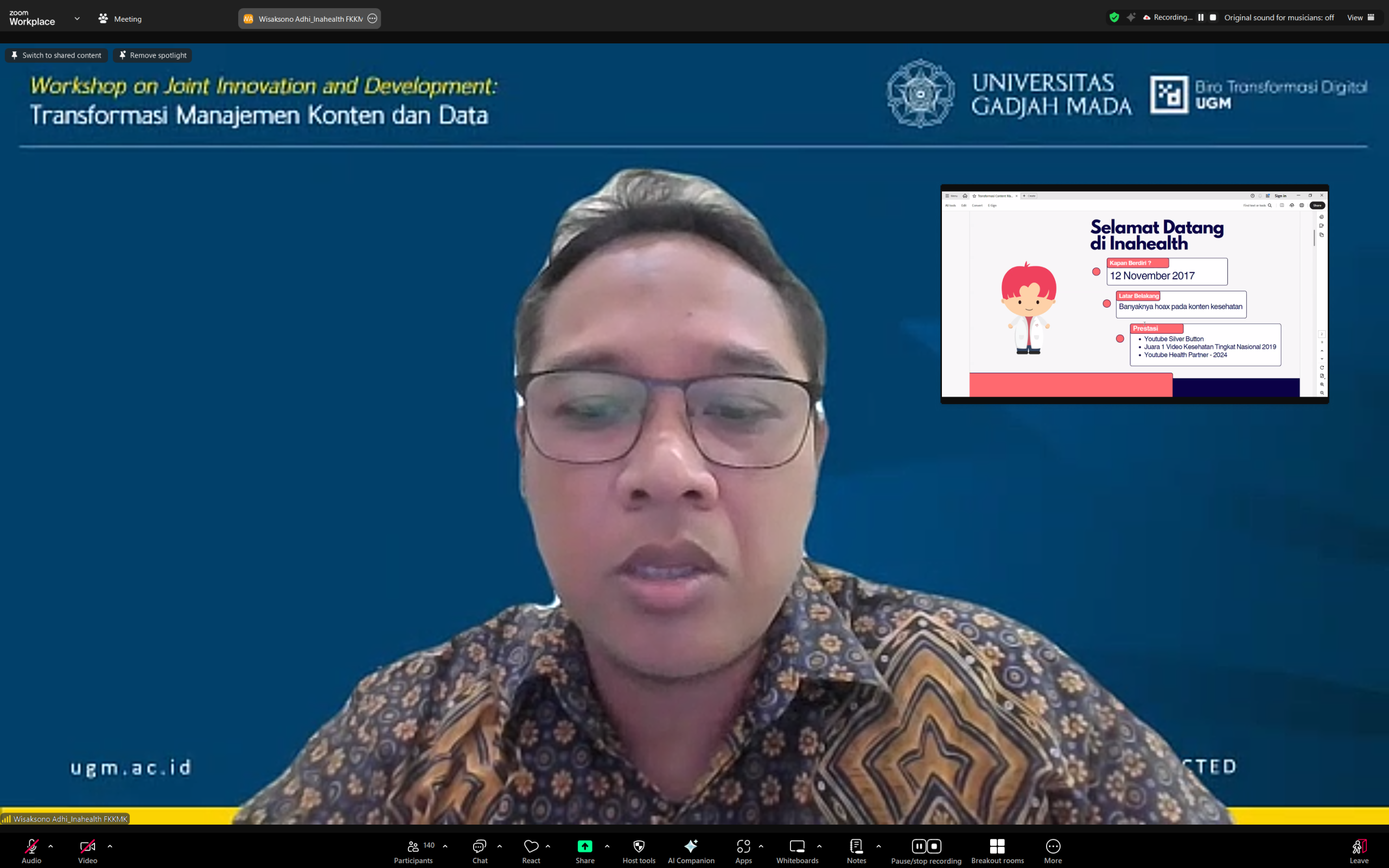 Materi pertama disampaikan oleh Wisaksono Adhi, S.PT, M.I.Kom. yang mengangkat praktik Inahealth sebagai studi kasus transformasi konten di ranah kesehatan. Ia menguraikan bagaimana tim Inahealth merancang siklus produksi konten mulai dari riset kebutuhan audiens, pemilihan tema, produksi video, hingga distribusi multi-platform.