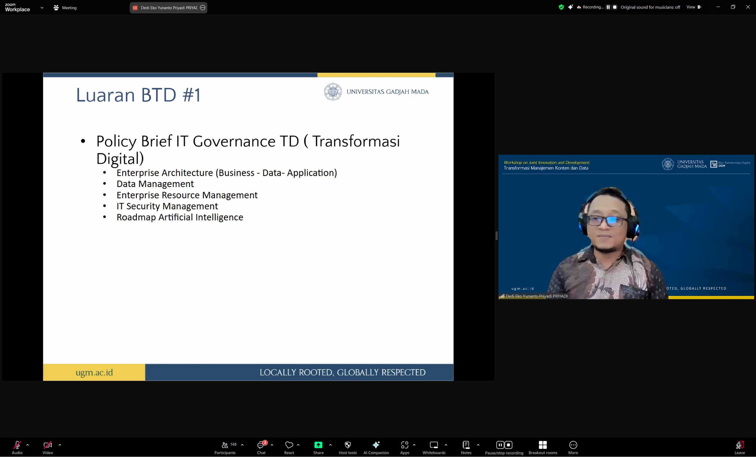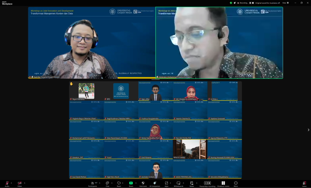 Hendranti Wisnu Saputro, S.T., M.Sc., memaparkan Progress Report UGM Satu Data, yang menyoroti temuan ketidakkonsistenan metadata di unit kerja. Upaya standardisasi penamaan data, pembuatan kamus data master, dan klasifikasi fakultas telah dilakukan untuk memastikan konsistensi dan sinkronisasi data yang lebih baik.