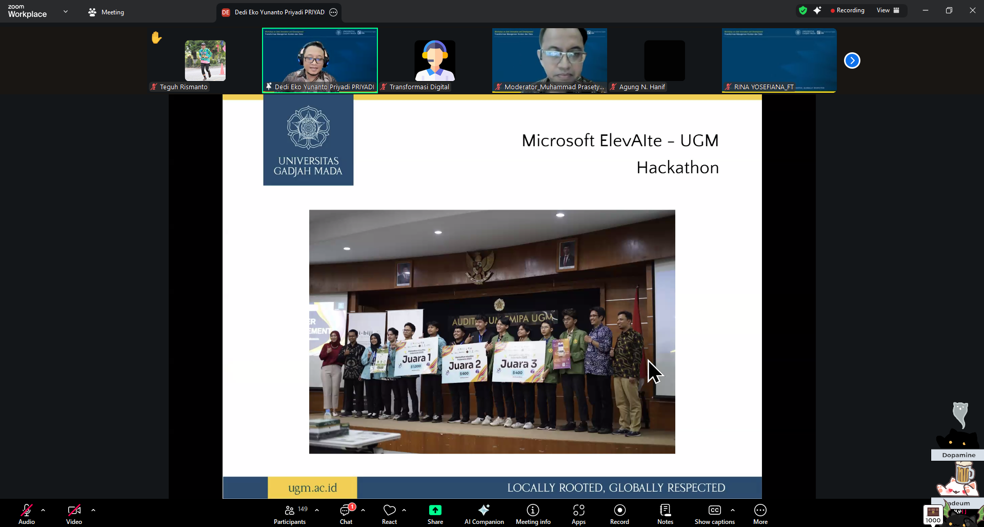 Materi ketiga dipaparkan oleh Dedi Eko Yunanto Priadi, S.T., yang menyoroti praktik baik transformasi digital layanan sertifikasi. Melalui kolaborasi dengan Microsoft dalam program ElevAIte, UGM berhasil menjadi platinum partner yang menyiapkan ribuan mahasiswa, dosen, dan tenaga kependidikan memperoleh sertifikasi AI internasional.
