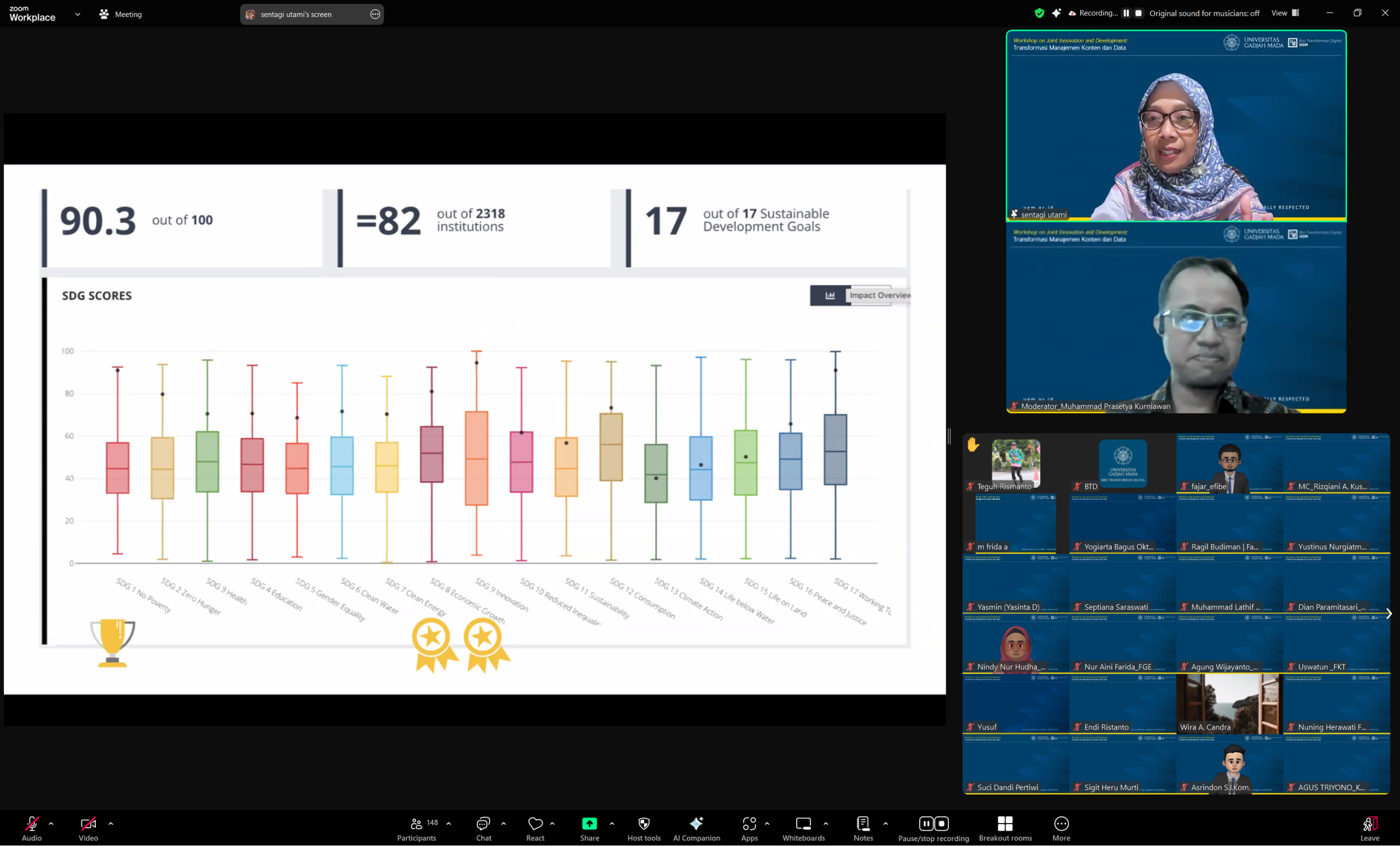 Materi keempat oleh Ir. Sentagi Sesotya Utami, S.T., M.Sc., Ph.D., IPU. menyoroti strategi peningkatan artikel terkait Sustainable Development Goals (SDGs) sebagai bagian dari reputasi global UGM. Saat ini, UGM menduduki peringkat 82 dunia dalam THE Impact Rankings 2025 dari 2.318 universitas.